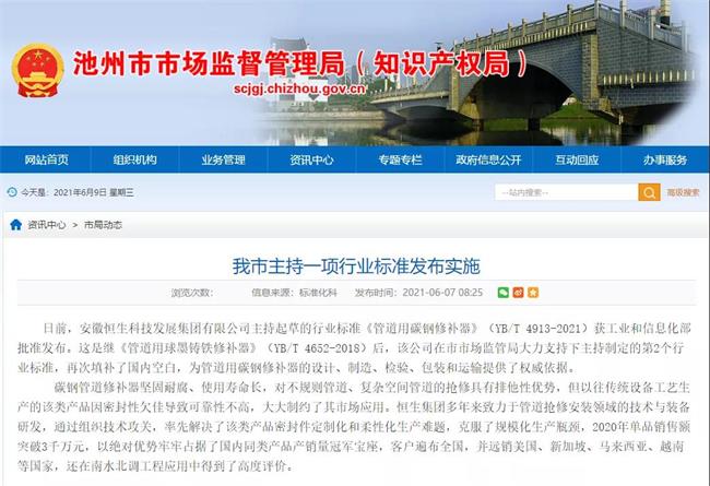 恒生集團多年來致力于管道搶修安裝領(lǐng)域的技術(shù)與裝備研發(fā),并已發(fā)展成為集微電子、機械、化工及彈性體密封件制造等為一體,擁有多家控股子公司的多元化、現(xiàn)代化企業(yè)。恒生集團是“安徽省高新技術(shù)企業(yè)”和“國家知識產(chǎn)權(quán)優(yōu)勢企業(yè)”,是多種材料標準的主要起草單位,2015年國家工信部批準了由恒生集團主持起草《管道用球墨鑄鐵修補器》的國家行業(yè)標準,該標準將于2018年9月開始實施,這對引導國內(nèi)管道修補器行業(yè)的發(fā)展有著積極而深遠的意義。